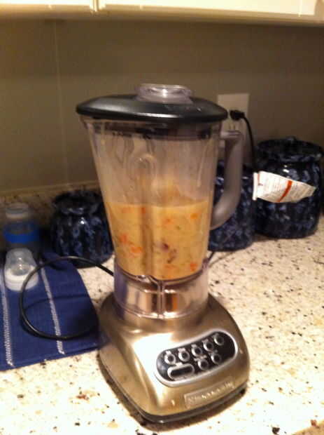 Una vez que las patatas estén tiernas, cucharón aproximadamente el 80% de la sopa en una licuadora y puré hasta que quede suave.  Añadir a la olla.