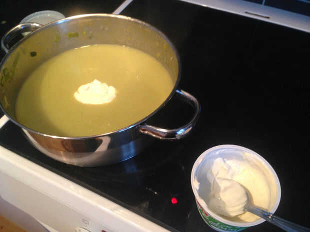 Añadir 2 dl (6, 7oz) de crema (normal crema funciona bien) y sazonar con sal y pimienta.