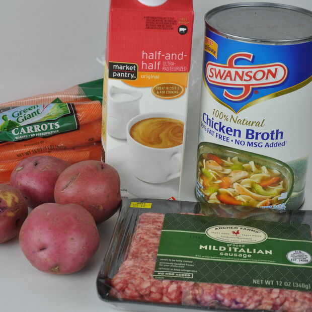 esta deliciosa sopa es grueso y abundante, con muchos vegetales y la bondad de tocino!Paso 1: Reunir los ingredientes Se reúnen los ingredientes:4 tiras de bacon (preferiblemente grueso corte)2 papas medianas de teja2 tallos de apio4 zanahorias1/2 ce