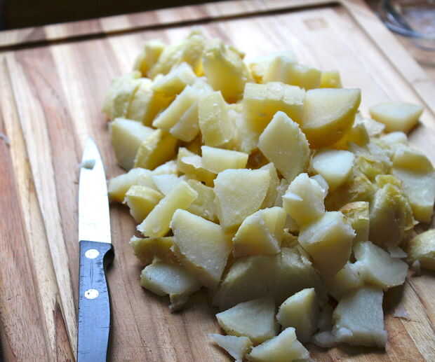 Asegúrese de que todas las patatas son peladas y cortadas en trozos.