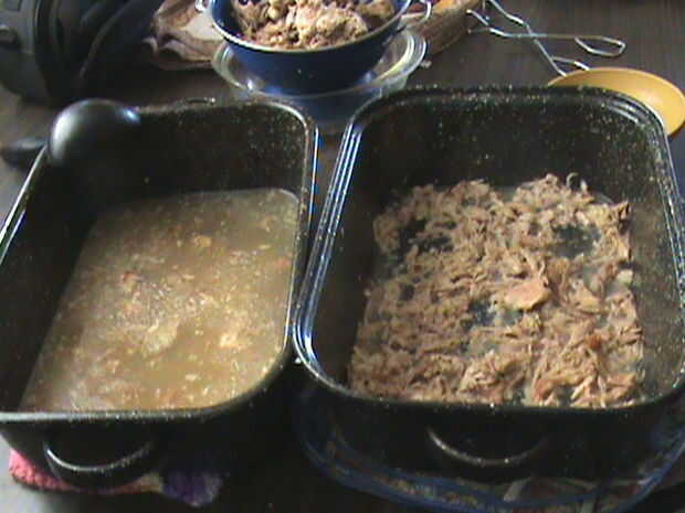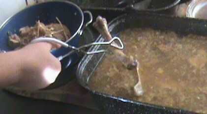 Una vez que todos los huesos son eliminados, verter el caldo con flotante de bits a través de un tamiz para devolver la sopa del tazón de fuente y debajo el colador en la sopa con los trozos de carne.