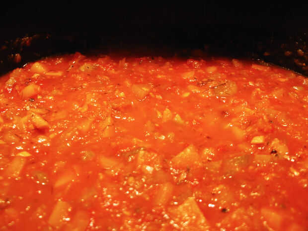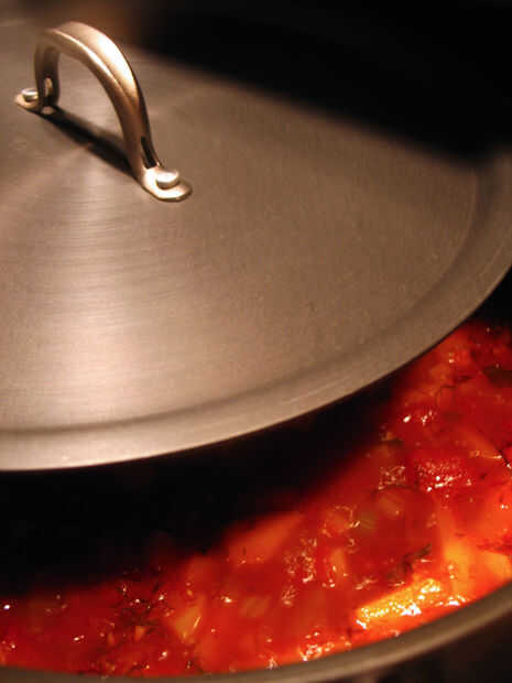 • Añadir vino, tomates, zapallo y caldo a la olla y llevar a ebullición.