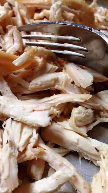 Permita que el pollo a cocinar lo suficiente como para manejar, entonces, con dos tenedores, separar la carne en tiras.
