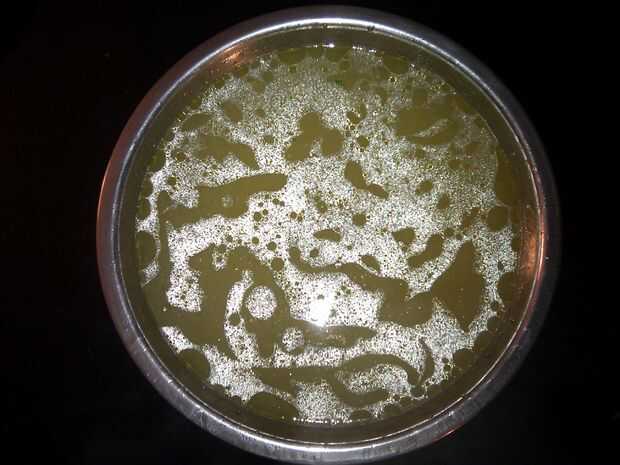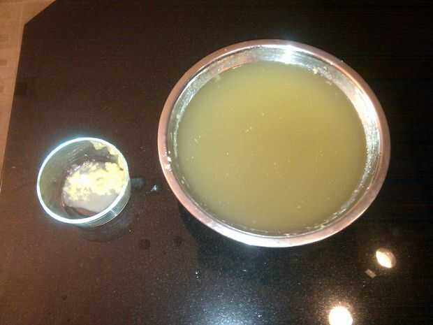 Colar el resto de los alimentos, por lo que te queda solo el líquido. Suele colocar en un bol y en el congelador por una hora, así que puedo capa superior de la grasa, pero esto es sólo una cuestión de preferencia personal.