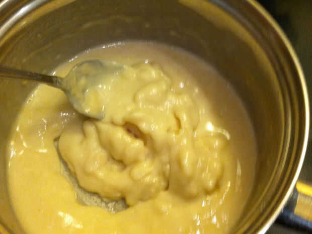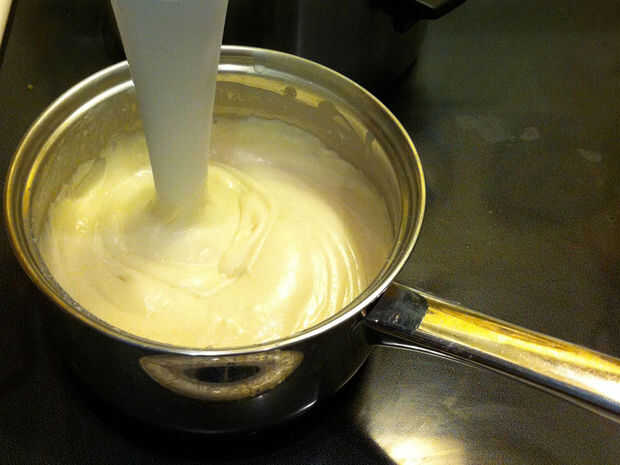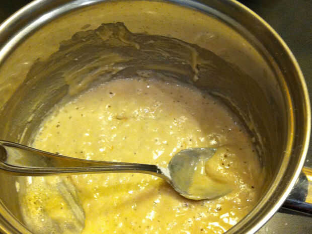 Luego agregar leche un poco a la vez. Se espesar para arriba rápidamente, no te preocupes, sólo mantenga revolviendo y agregar leche hasta obtener el espesor deseado. Utilice un palillo de la batidora o licuadora para obtener realmente suave.