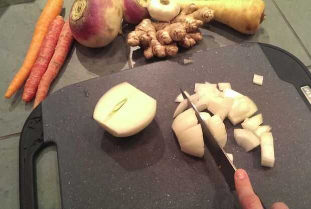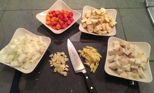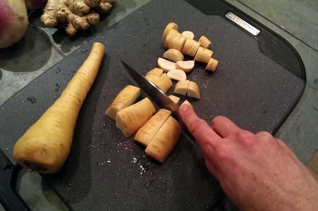 Picar las chirivías, nabos y zanahorias en cubos de 3/4" aproximadamente iguales y reservar.
