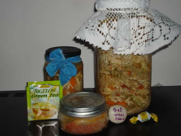 Para el cuidado de un paquete sólo tiene que añadir cosas uno tomaría para un frío junto con la sopa. Puede Agregar un poco o añadir mucho. Podría hacer un paquete familiar porque muchas veces todos los miembros de la familia consigue enfermo. Puede hacer la sopa en una olla y llevarte el bote entero a un familiar enfermo. Muchas opciones diferentes que podría hacer para este tipo de regalo. Añadir sales de baño receta aquí: Bálsamo de labio:, velas, gotas para la tos cómo aquí: frotación del Vapor, jugo de naranja, vitamina C, té, haz bien rock, spray para la garganta, o footie de sólo para nombrar unos pocos.