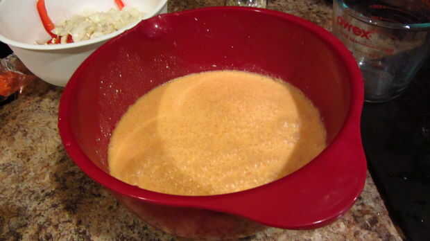 Mezclar el caldo de pollo, leche de coco, pasta de curry rojo, jengibre y ajo en un tazón grande. (Nota: a veces leche de coco puede formar una capa gelatinosa grande en la parte superior así que si tienes problemas para revolver a la mezcla, coloque toda la mezcla en la licuadora durante un minuto en baja)