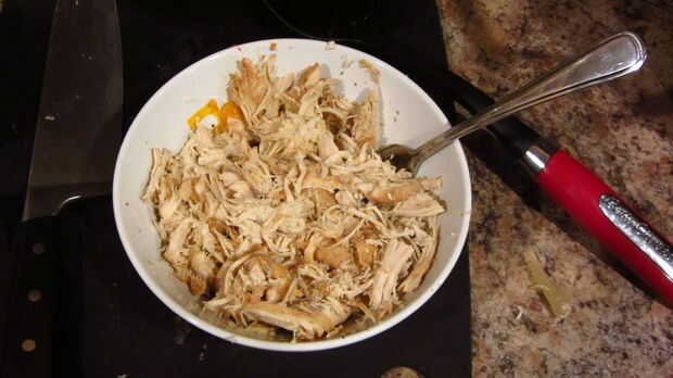 Colocar los muslos de pollo en la olla con un poco de caldo de pollo y cocine en bajo durante 4 horas. Una vez que el pollo esté cocido, retirar de la olla y triturar con un tenedor. Colar el líquido restante de la olla de cocción lenta.