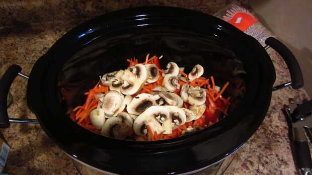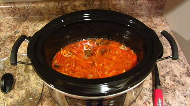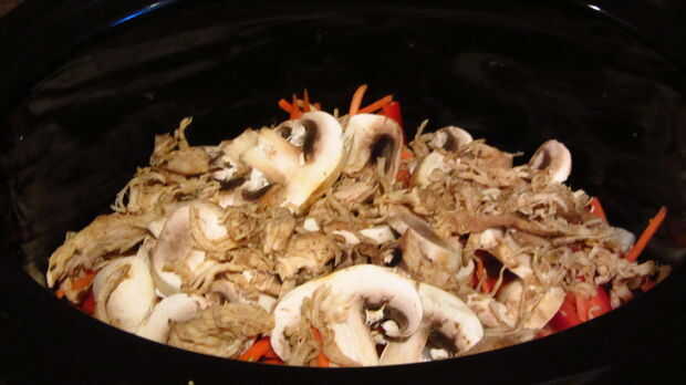 Poner la mezcla de verduras en el fondo de su olla y cubra con el pollo desmenuzado. Vierta la mezcla líquida en la parte superior y cocine en bajo de 5 a 6 horas. Después de la cocción, ponga una pequeña cantidad de jugo de limón en la mezcla, mezclar y servir!