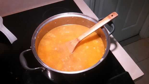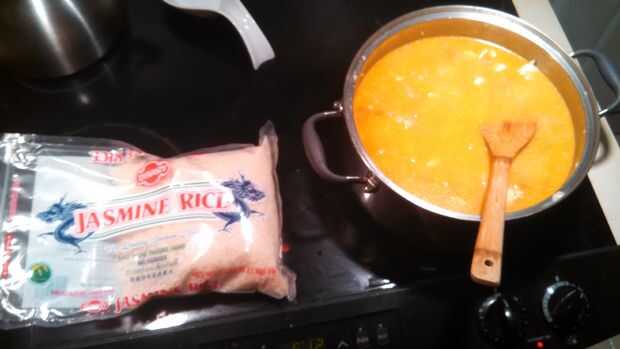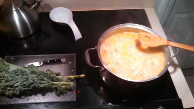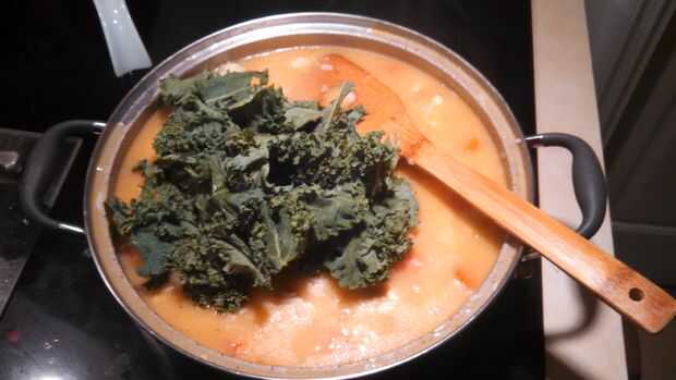 Ahora sobre el arroz. Mi papá una vez añadido demasiado arroz en una sopa de pollo que hizo hace años y así que pegan. Ahora prefiero mis sopas de pollo y arroz para ser pesado en el arroz. Realmente no medir hacia fuera a añadir arroz hasta creo que hay suficiente. Si he añadido demasiado arroz que sólo tendría que añadir más agua para compensar. Para esta sopa usé casi un tercio de la bolsa. Una vez que el arroz se añade de nuevo el calor al medio. Debe revolver constantemente para asegurarse de que el arroz no se pegue al fondo y grabar. Como se expande el arroz agregue más agua según sea necesario para mantener la consistencia deseada. Las verduras deben ser tiernas al mismo tiempo que se hace el arroz. A continuación una vez que el arroz y las verduras se cocinan completamente había apagado el calor y agregué en los pedazos de col rizada y mezcladas en la sopa. A pesar de que el calor es de la sopa está caliente mucho y cocine la col rizada.
