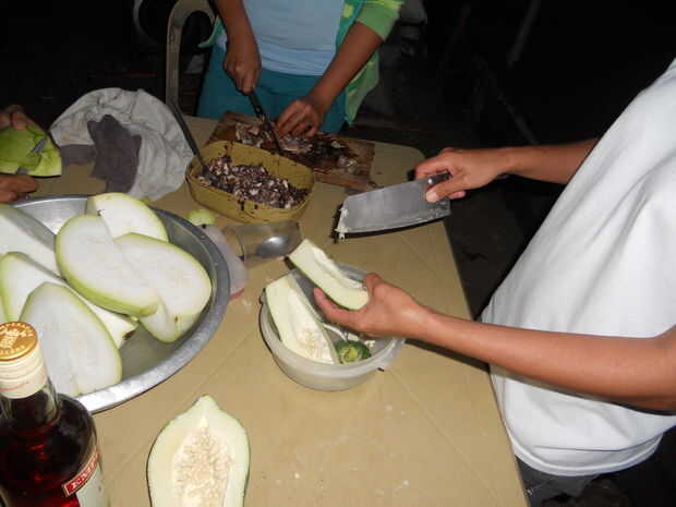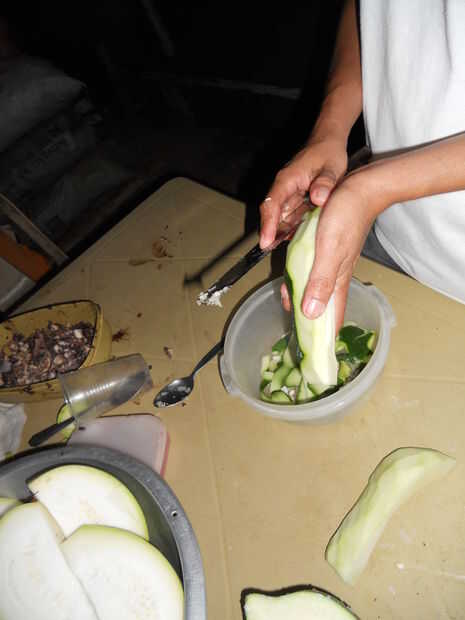 4) cuarto de la papaya. Deseche las semillas y cosas sustanciales en el medio. Cáscara. Chop en aproximadamente 1" en trozos. Esto no es trabajo de preparación de precisión.