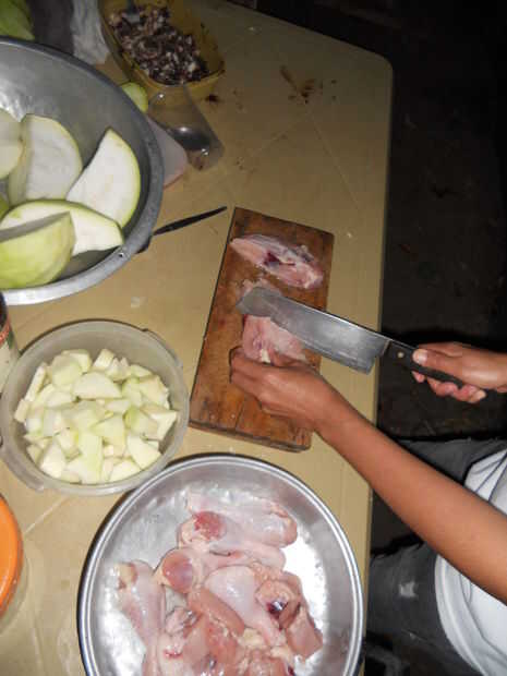 3) Quite la piel de los senos. Picar las pechugas de pollo en trozos de 2" por lo que se cocina sobre tan rápidamente como las baquetas. Dejado la piel en los muslos porque los niños no les importa.