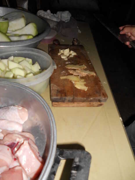 2) cortar el trozo de jengibre bastante fina y luego aplastar con la parte plana de la cuchilla