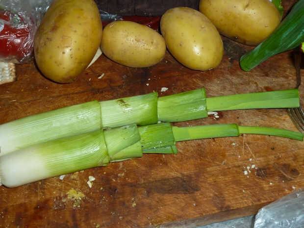 Primer paso es limpiar los puerros. Aviso que he recortado alrededor de los puerros, quitando las partes verdes oscuras y dejando las partes verdes blancas y ligeras.