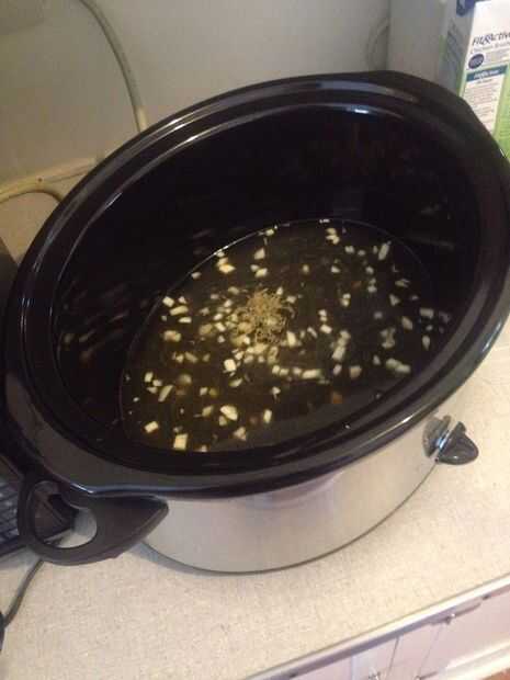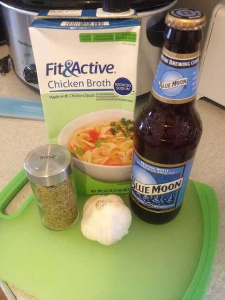 Combinar el caldo, cerveza, cebolla, ajo y tomillo en la Crock-Pot. Cubra y cocine en bajo durante cuatro horas. No olvides ajustar un temporizador.
