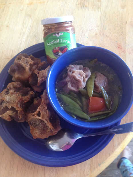 Servir la sopa espolvoreada con más frito cebolla (y si tienes hojas de cilantro) junto con rabo frito y salsa picante (sambal)