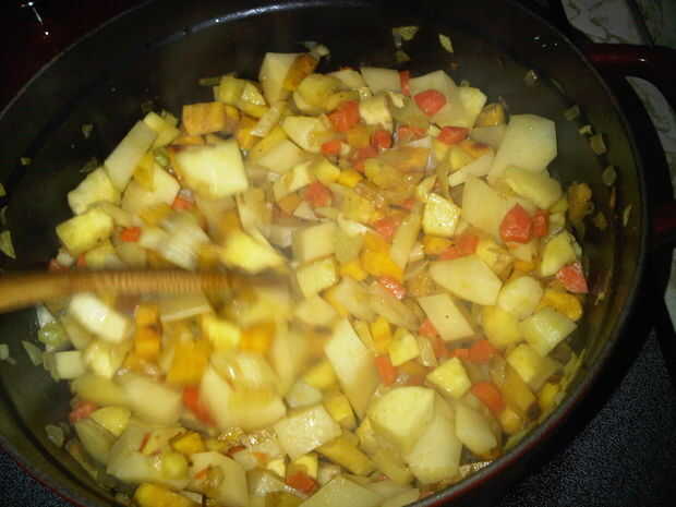 Caramelizar las verduras-permitir que los tubérculos a cocer en la olla saca los azúcares naturales de las verduras. Esto añade cierta profundidad necesaria a esta sopa.