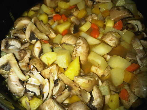 Permitiendo la sopa a fuego lento ya hará que las papas y batatas que se descomponen, produciendo un guiso espeso de acelgas y champiñones.