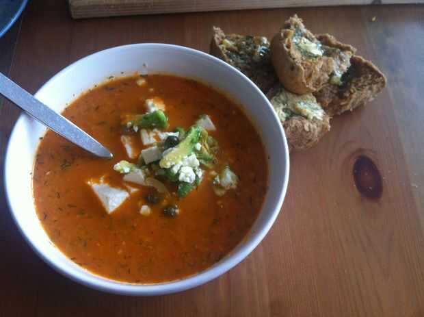 Sopa fría de sandía y tomate con queso de oveja, aceitunas y perifollo