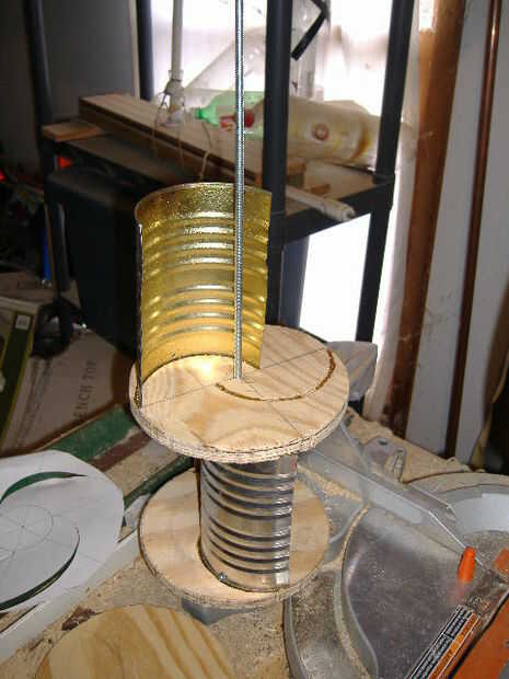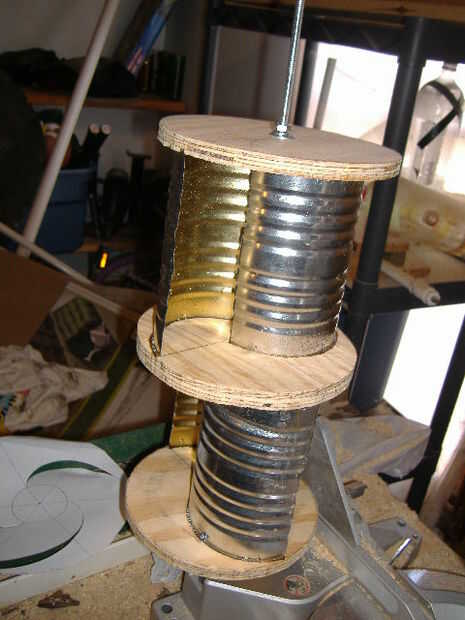 Agujeros del centro. Perfore un agujero en todos los discos de la varilla roscada su uso. Cuanto menor sea la varilla roscada mejor el flujo de aire a través de la superposición. Hay un propósito a la superposición de 18.7%. Es como el viento empuja sobre el revestimiento puede, algunos de los flujos de aire a través de la superposición y empuja hacia atrás en el otro puede, añadiendo energía y puede compensar un poco el viento empujando en la parte posterior de la otra.