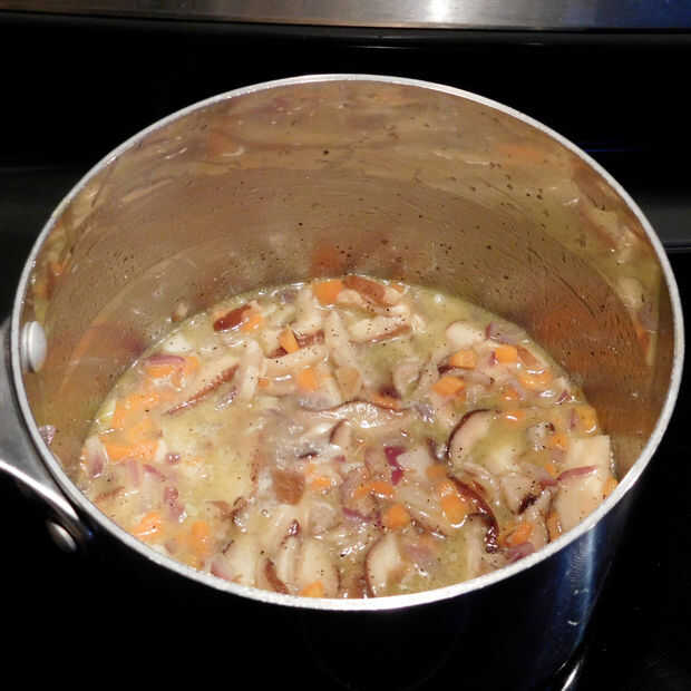 Añadir setas shitake y continúan sofría hasta que las setas suelte sus jugos y la mezcla se vuelve acuosa. Agregue el caldo y llevar a fuego lento bajo durante 10-15 minutos.