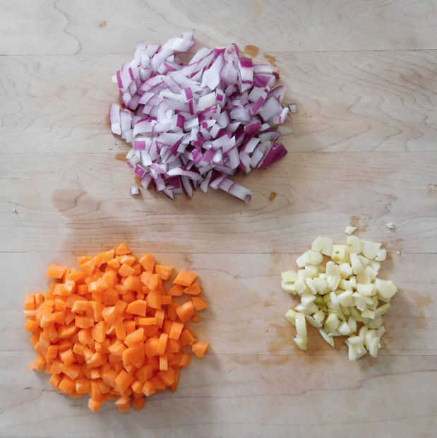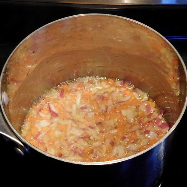 Caliente el aceite y la mantequilla en una olla mediana sobre fuego medio alto. Añadir la cebolla, las zanahorias y el ajo. Sofría hasta que la cebolla se transparente y suavizan las zanahorias.