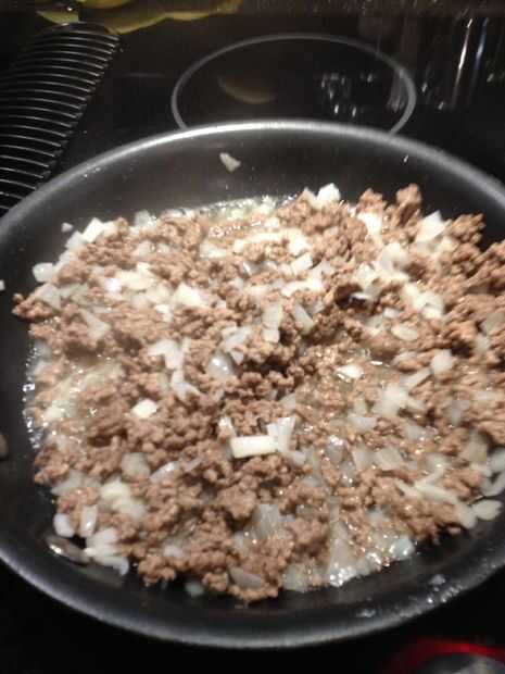 Dorar la carne y sofría las cebollas juntas. Se mezclan.