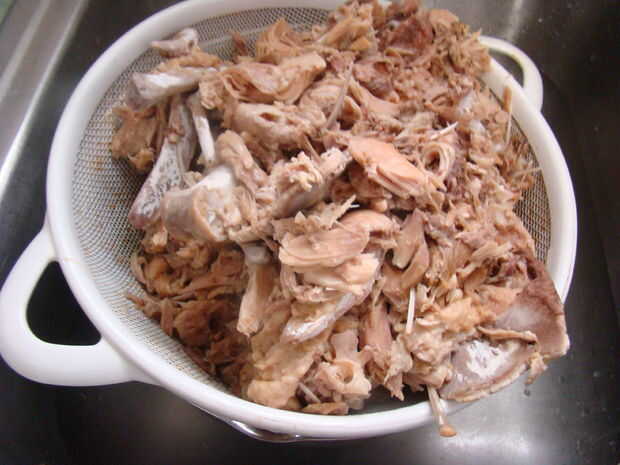 Una vez que están las 24 horas, colar los huesos, etc. del caldo.  Poner en el refrigerador que puede enfriar a temperatura de manejo.  Esto le llevará un par de horas.  Una vez que los huesos son lo suficientemente frías como para manejar, con las manos impecablemente limpias, separar las piezas grandes de carne de los huesos, tendones, piel, etc..