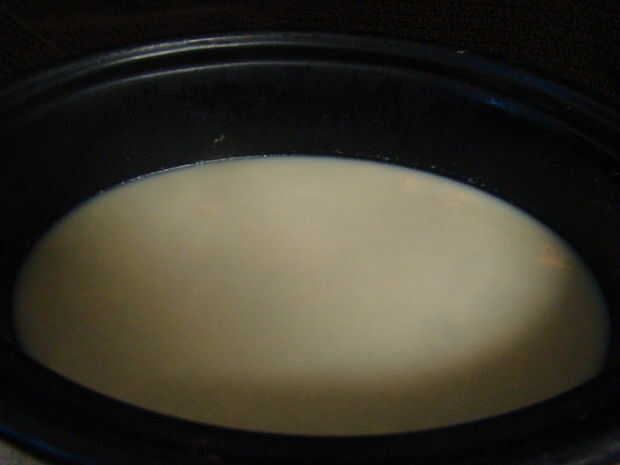 Aquí está el caldo enfriado para que toda la grasa ha flotado en la parte superior y se volvió sólida.  Ahora si usted o alguno de sus seres queridos, no tiene problemas cardíacos, etc. dejar ahí la grasa, agrega sabor.