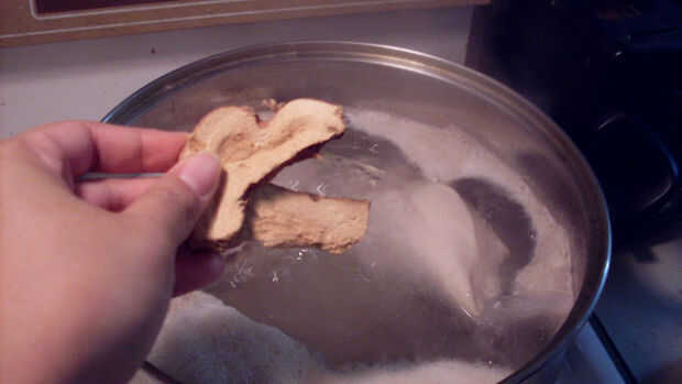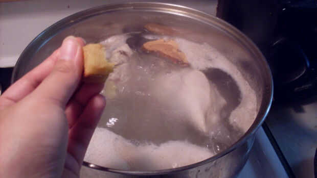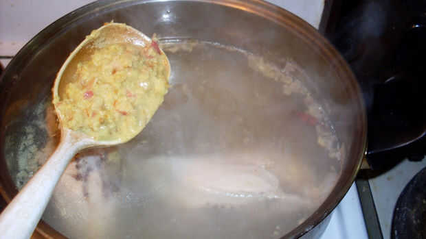 Deje que el agua hierve durante 5-10 minutos luego bajar el fuego a medio y dejarlo cocinar a fuego lento durante 45 minutos