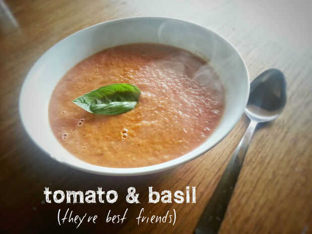 Qué hace esto tan rápido es que el tueste sólo requiere picar vegetales en medio. Realmente, si usted es corto el tiempo de preparación puede incluso dejas todo (y hornear durante más tiempo). Es tan simple y puede ser modificado con cualquier verduras desea (por ejemplo, zanahorias, coliflor etc.). En este caso tenía una hermosa planta de albahaca y algunas empresa de tomates (no muy maduros) y fue una de las sopas de tomate más sabrosas cada vez.
