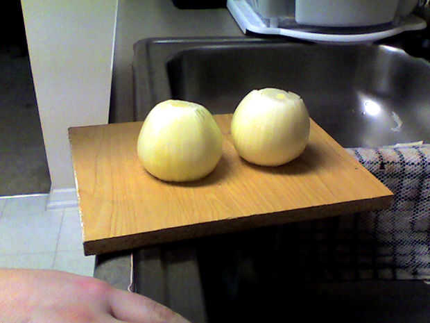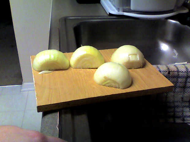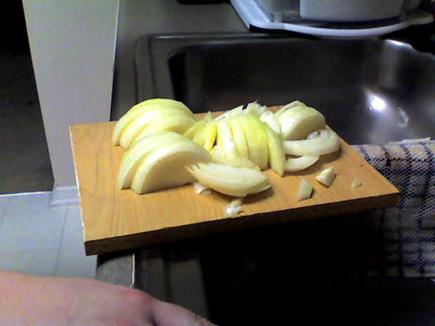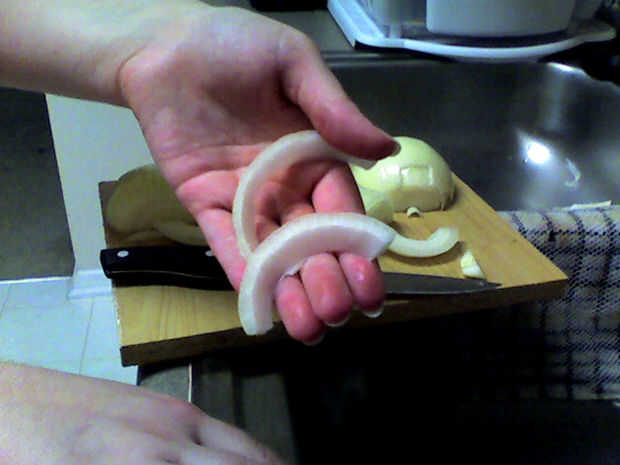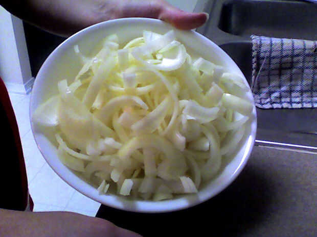 Retire y enjuague la cebolla. Cortar por la mitad y luego picar para que usted obtenga piezas largas. Al ver la cantidad de cebolla que tenía, decidí añadir una tercera. Me encanta la cebolla! Colocar en un recipiente separado para más adelante. Ir a otra habitación durante unos minutos con una toalla húmeda sobre los ojos hasta que deja de llorar. He escuchado que poner la cebolla en la nevera durante unas horas antes de usarlos le ayudarán con esto, pero soy una cocina de último minuto y no pensar en ello antes. Quiero saber los resultados si alguien intenta!