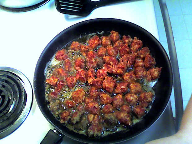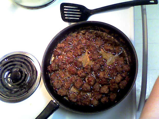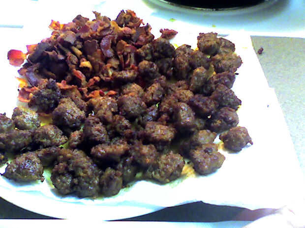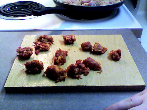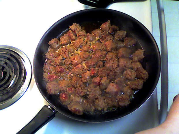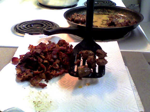 Retire las cubiertas de cada salchicha (¡ odio morder en ellos!) y deseche. No quiere flotando en la sopa, confía en mí. Picar en pedazos mordedura-clasificados y freír en la grasa de tocino. Una vez cocida (el interior será agradable y marrón), retirar a un plato cubierto con toalla de papel.