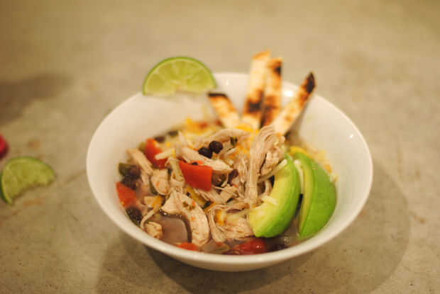 Hice esta sopa en un intento de recrear la sopa de tortilla de Qdoba.  No es lo mismo, pero sigue siendo bueno.Ingredientes1/4 manojo de cilantro3 dientes de ajo1/2 cebolla pequeña1 chile jalapeño1/2 Chile poblano1 lata de tomates o cantidad equivale