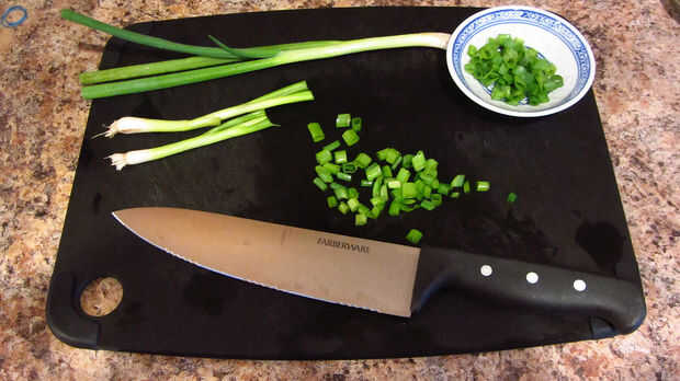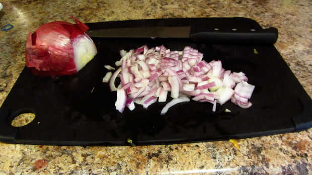 -Corte la cebolla por la mitad. Quitar la piel y dados en pequeños pedazos