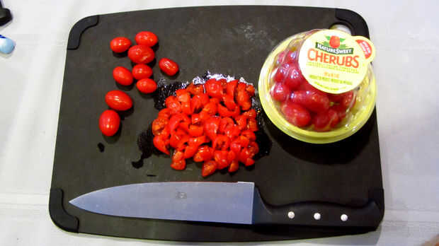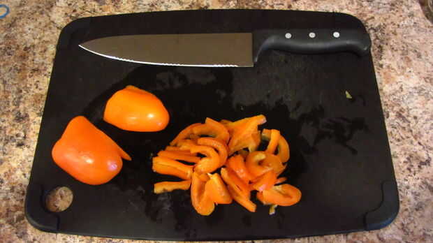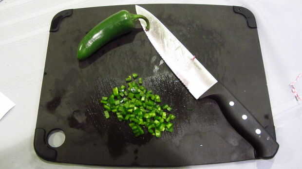 -Corte el tallo de su jalepeno pimienta, partirlos por la mitad y retire las semillas. Cortar trozos más pequeños que se puede gestionar. Repita este paso para el pimiento rojo a excepción de mantener las piezas en cuadritos un poco más grandes