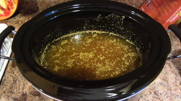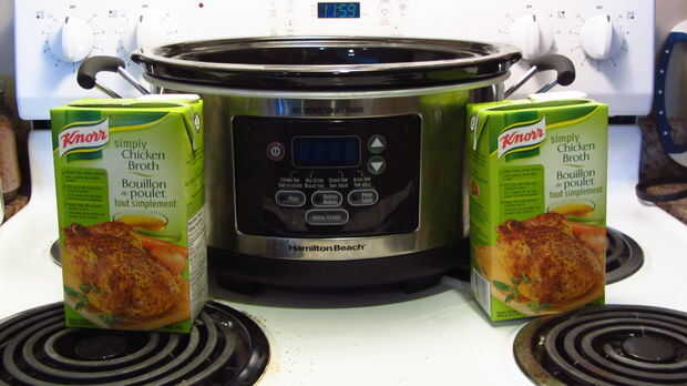 Vierte seis tazas de caldo de pollo en la olla de cocción lenta.