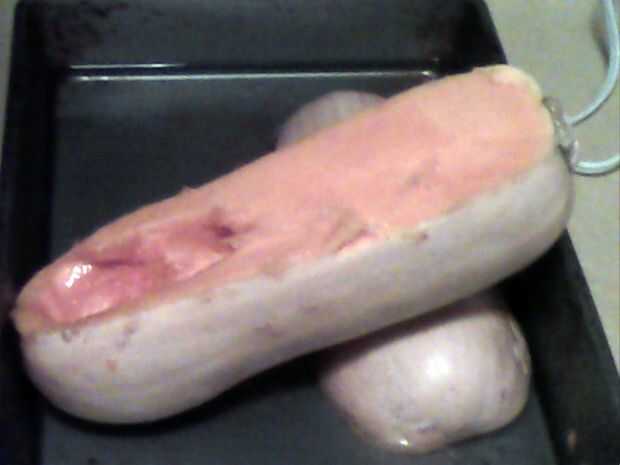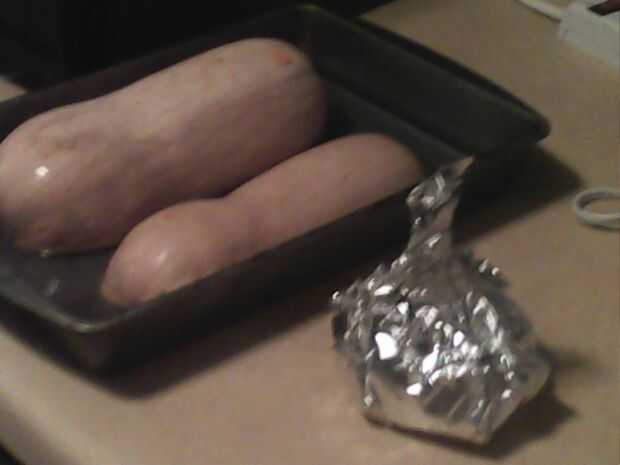 Corte de calabaza por la mitad a lo largo y retire las semillas y cadenas. Coloque el lado del corte hacia abajo en fuente para horno con agua suficiente para cubrir el borde de corte de la calabaza.