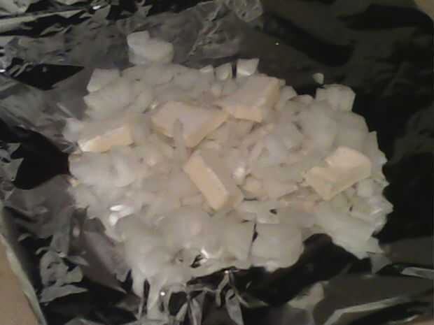 Mezcla las cebollas picadas con mantequilla de palillo de 1/8 cortado en trozos pequeños. Envolver en un paquete de papel de aluminio.