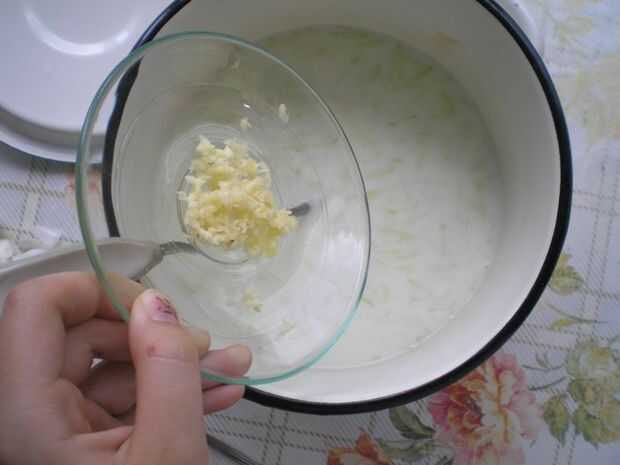 1. poner el yogur en la olla y revuelva hasta que todos los terrones pequeños desaparecen y luego añadir el agua. 2. rallar el pepino y añádelo a la olla. 3. Machaque el ajo y añadirlo a la olla. Revolver. 4. Añadir la sal y revuelva otra vez. 5. Si lo desea puede Agregar eneldo.