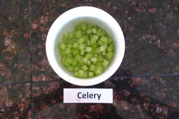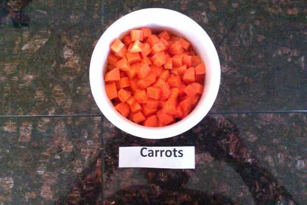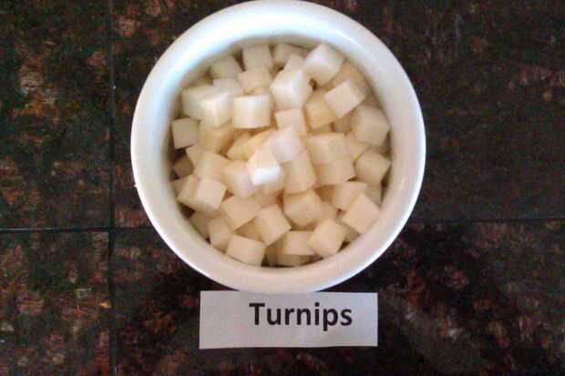 Dados las zanahorias, nabo y apio tallo. cortar la cebolla en trozos grandes.