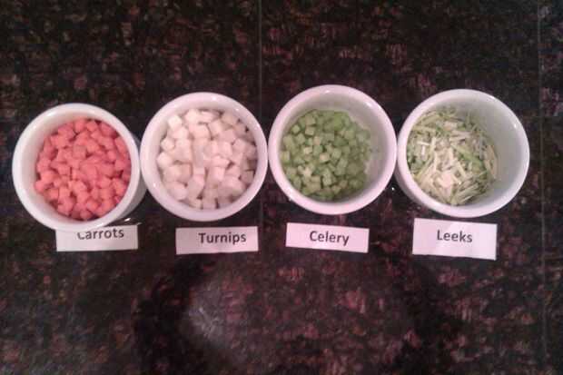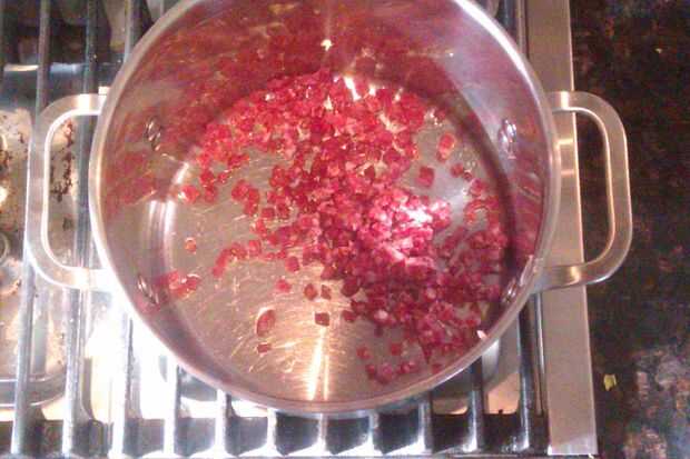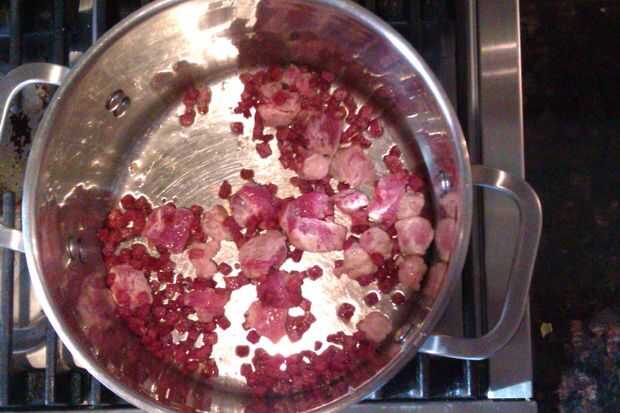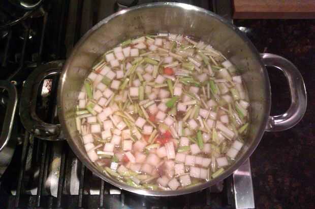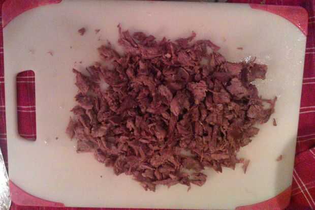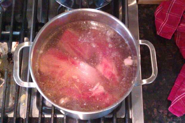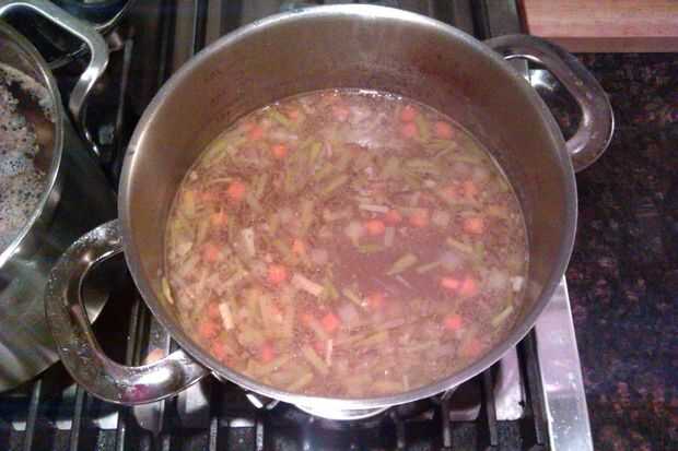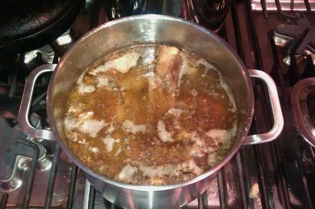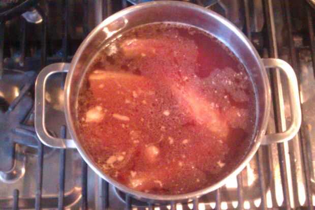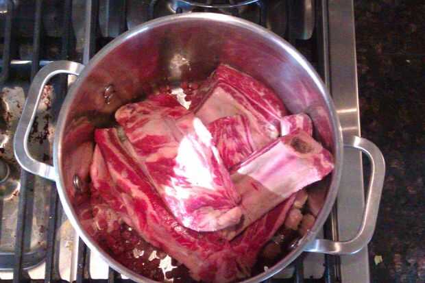 En una olla grande agregar salame picado y cocinar durante dos o tres minutos añadir carne de cerdo y cocinar hasta Dora la carne de cerdo. Agregar las costillas de carne de vacuno y ramillete de hierbas con agua fría y cocinar durante al menos tres horas en baja. Ser paciente en este paso y no tratar de apurar el proceso que desea que todos la bondad de salir poco a poco, si es necesario agregar más agua asegurarse de que está frío. Cuando dejarlo enfriar y colar, retire las costillas y la carne de los huesos de la tira, utilice sus dedos para apretar la carne del tejido conectivo. Cortar en trozos pequeños. Mantenga la carne de costilla y la acción.