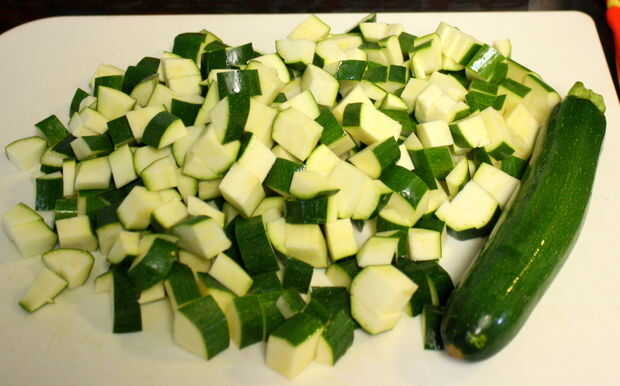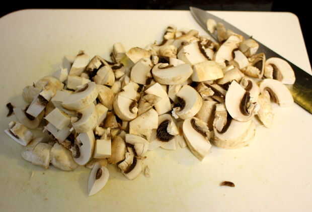 Grueso picar y añadir las verduras más duras. Esto incluye las setas, calabacín y todo lo que utilizas (guisantes, col rizada, etc.) que tiene un contenido de agua baja y tarda más en cocinar.