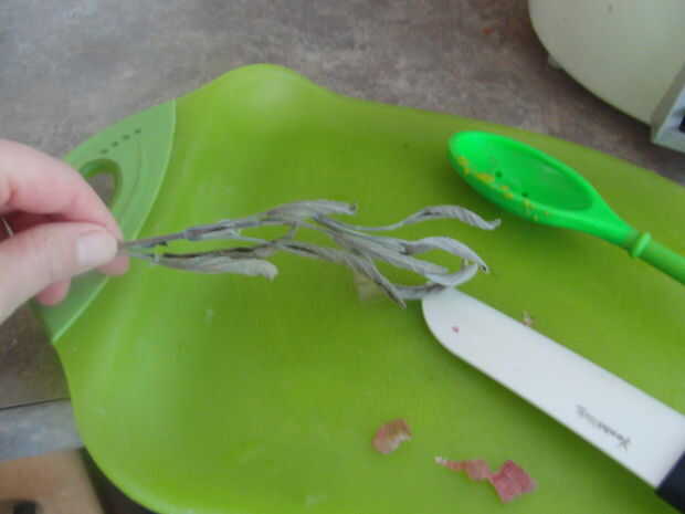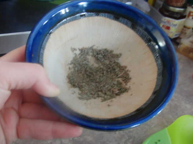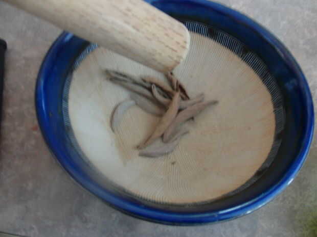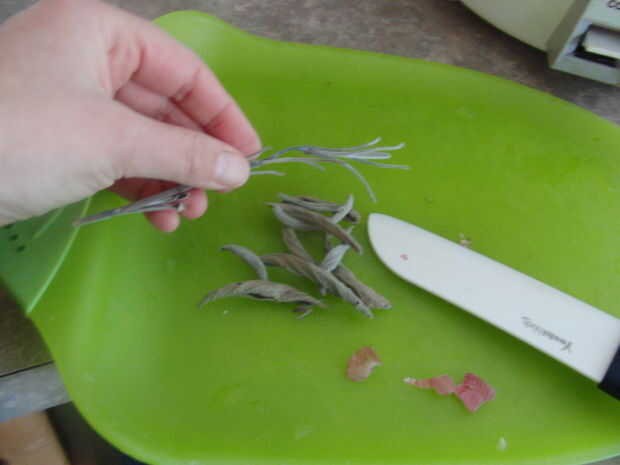 yo he secado ramas de salvia de mi jardín de hierba colgando en la ventana de mi comedor, así que escogió unas cuantas hojas, machacado en un mortero y añade el sabio picado a la olla.