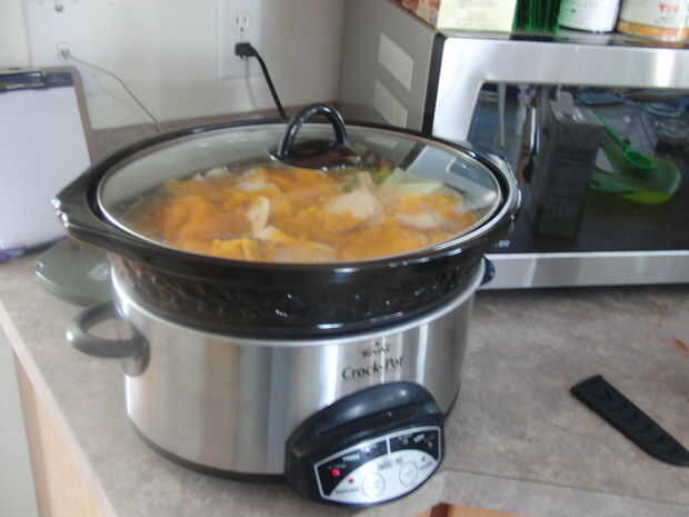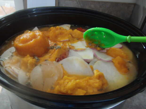 Revuelve la olla y luego establece durante 6 horas en lo alto. Es importante comprobar periódicamente y revuelva para asegurarse de que no sobrecocinar la sopa. Quería que las verduras que cierta firmeza.