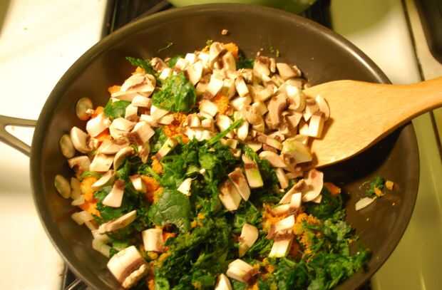 • Después de unos minutos, agregar la espinaca picada y las zanahorias de la juguera y los hongos