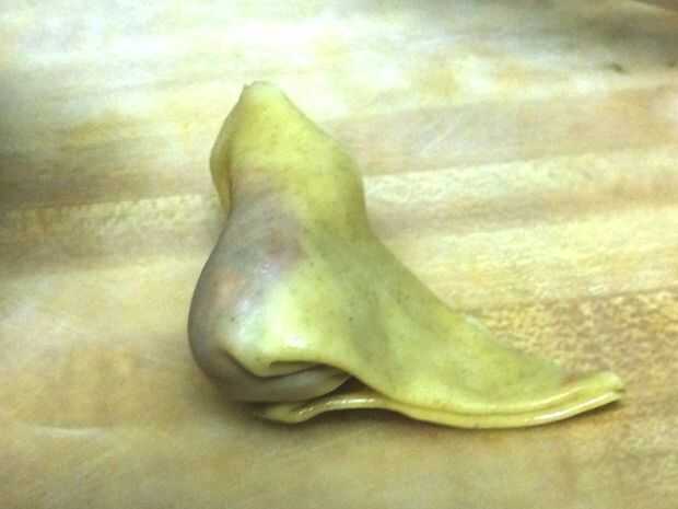 4. Sumerja el dedo en el lavado de huevo otra vez y ligeramente ejecutarlo del lado derecho del triángulo inferior a primera base. Besar la primera base y tercera base juntos firmemente. Asegúrese de que no haya ningún espacio entre las 2 bases y a lo largo de esa línea a la albóndiga. El wonton debe tener una punta en la parte superior, una media redonda y una cola triangular.