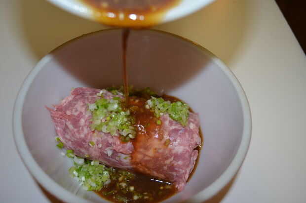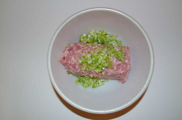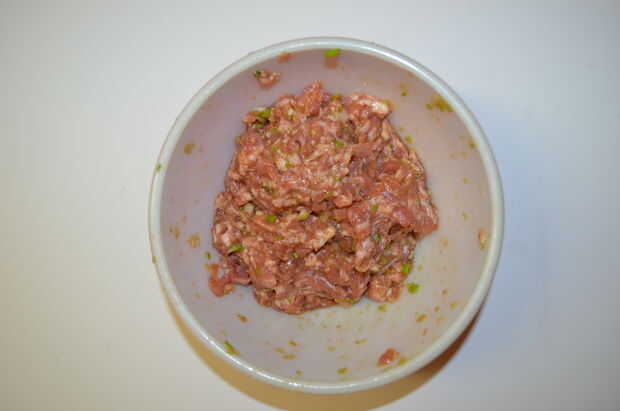 En un tazón mezcle la cebolla carne de cerdo, sal y verde. Luego en un recipiente aparte combinas los líquidos, al igual que la hornada! Por lo tanto, combinar el huevo, salsa de soya, jerez seco, aceite de sésamo y jengibre raíz. Después de que es llevado a bien verter en la mezcla de carne de cerdo y combinan todos esos sabores maravillosos.