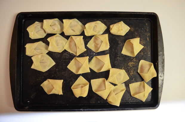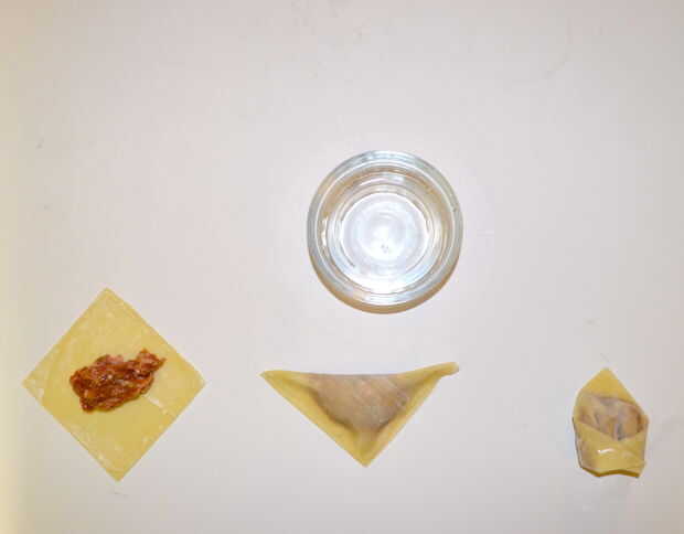 Doblar los wantanes como en la foto. Mojar los bordes les ayuda a pegarse un poco mejor.